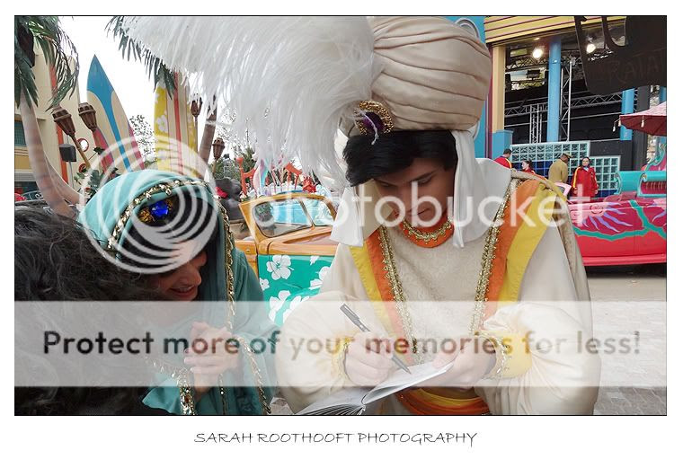 Ook Lilo & Stitch stonden in onze buurt, maar het was Aladdin die het eerste mijn boekje in de gaten kreeg. Ook zijn reactie was super. "Oh wow, this is beautiful". Toen ik zei dat ik het zelf gemaakt had ging hij er in bladeren. "I got to show this to Jasmine". Jasmine stond enkele stappen verder en Aladdin riep haar tot bij hem. "You've got to see this, she made it herself", zei hij tegen haar. En samen gingen ze in het boekje bladeren. Ook Jasmine was onder de indruk en zei dat het echt mooi was. Daarna gingen ze tekenen en nog even poseren voor een foto. Jasmine had niet veel tijd want die werd op het podium verwacht.