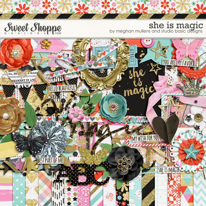 You probably all know I'm not a fan of glitter. I hardly ever use it in my layouts. But that changed today... Ru from Studio Basic and Meghan Mullens created a gorgeous new collab called She Is Magic. And it has glitter and gold. Lots of Gold. And I love it! The gold and black are great together and the pink, orange and blue make the kit just perfect.